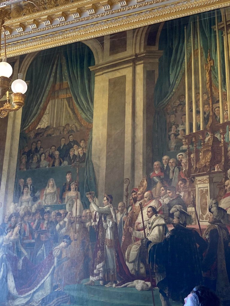 While in Paris, I was able to see several important buildings connected to Napoleon. The first picture is of the Military Academy of Paris where Napoleon trained for his military service. The next are of Napoleon’s greatest architectural feat, the Arc de Triomphe. Not completed until after his death, it marks the western edge of the Champs-Élysées and today is not only for parades but the end of the Tour de France. It is an impressive structure. Then the chapel of the Invalides is where Napoleon was eventually brought back for permanent burial. It is a grand church and dominates the region. Finally, even though he never lived in Versailles, there is one room which has a copy of the Coronation of Napoleon.