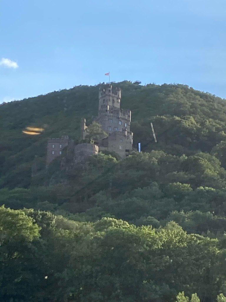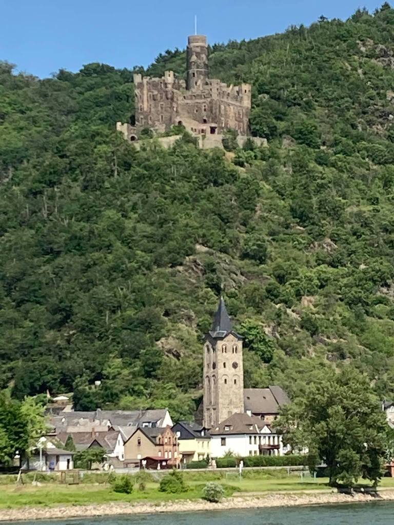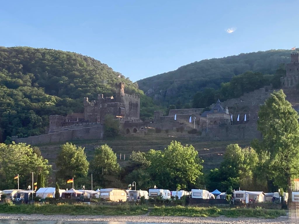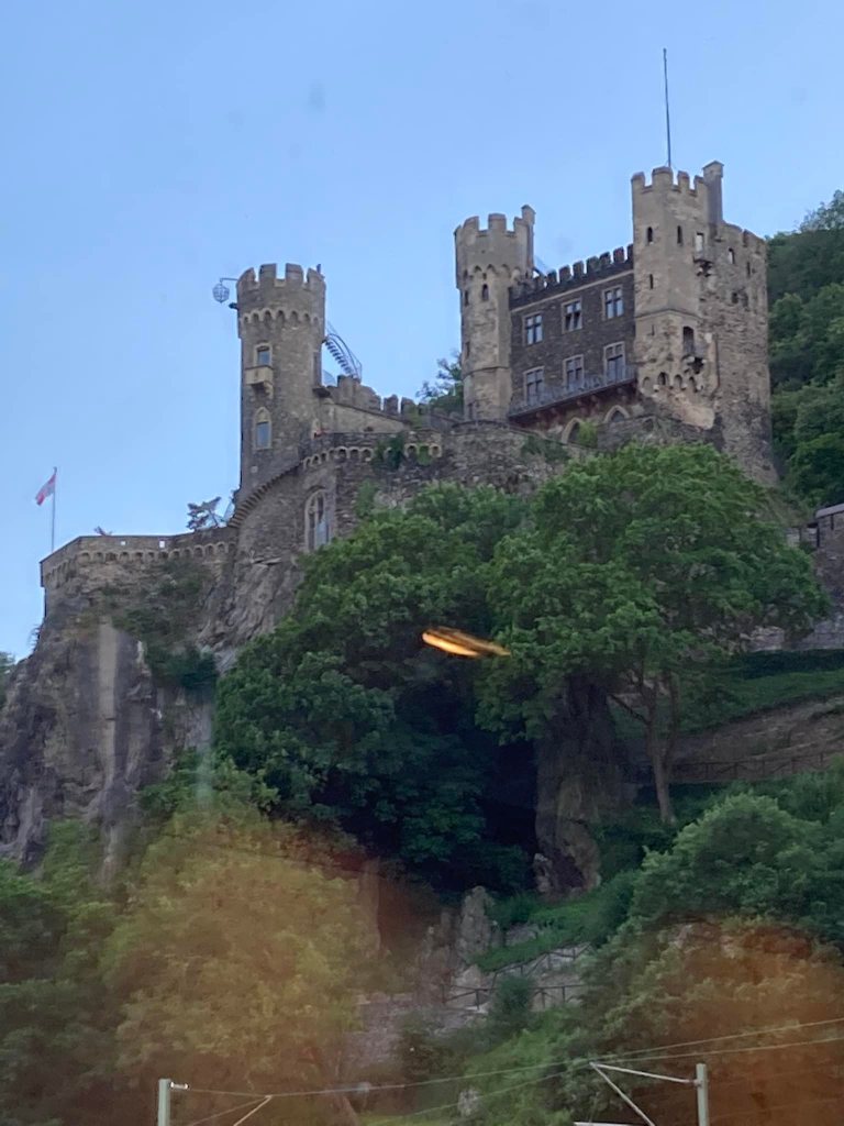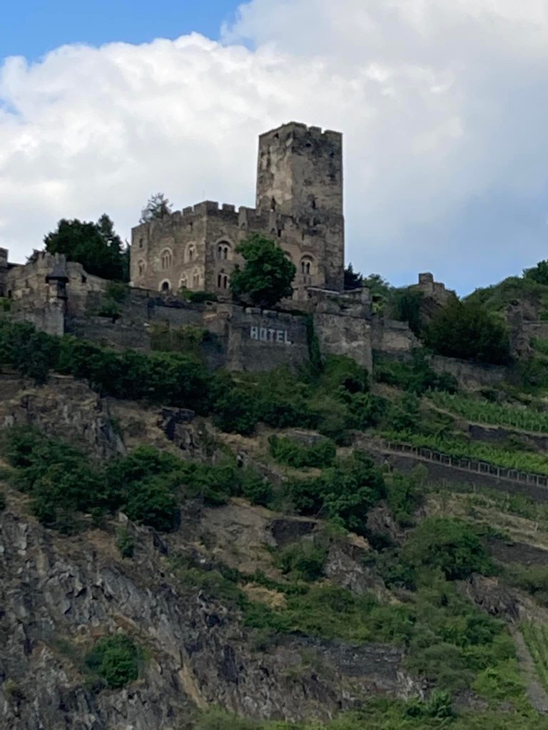 Now replace the Neckar with the Rhine and a raft with a 443-foot boat and you can understand how we spent Monday afternoon. I sat on the top deck in perfect weather, sipping a drink and watching castles go by. Such beautiful landscape! Tall mountains on either side with only enough room for small villages, each with its own castle. If its not small villages it’s full of campgrounds. People from all over Europe come to this area with their tents and campers and relax by the river.