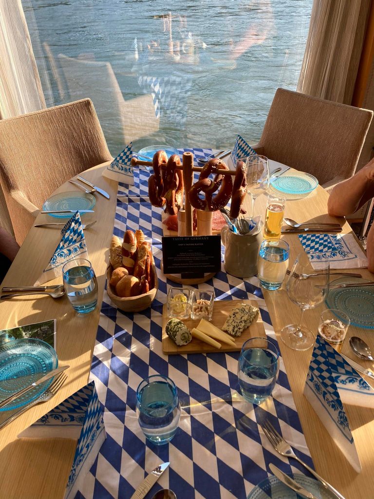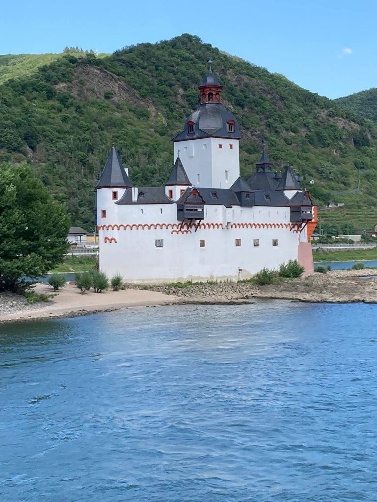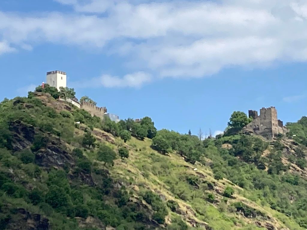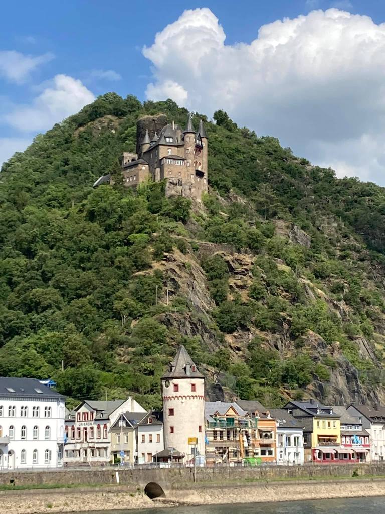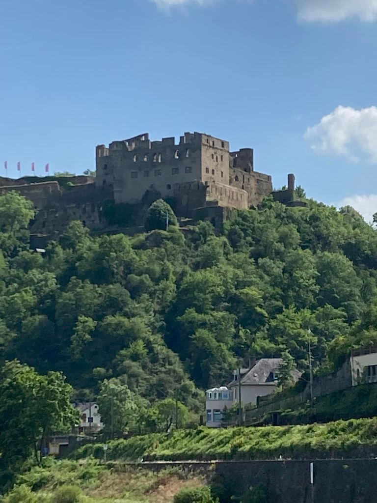 Now replace the Neckar with the Rhine and a raft with a 443-foot boat and you can understand how we spent Monday afternoon. I sat on the top deck in perfect weather, sipping a drink and watching castles go by. Such beautiful landscape! Tall mountains on either side with only enough room for small villages, each with its own castle. If its not small villages it’s full of campgrounds. People from all over Europe come to this area with their tents and campers and relax by the river.